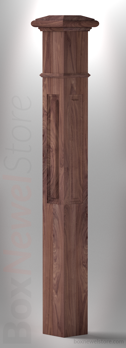 Box Newel Store Classic Walnut Box Newel, SFI Classic Cap with Cove, Lower Raised Panels, Pencil Mold Trimband