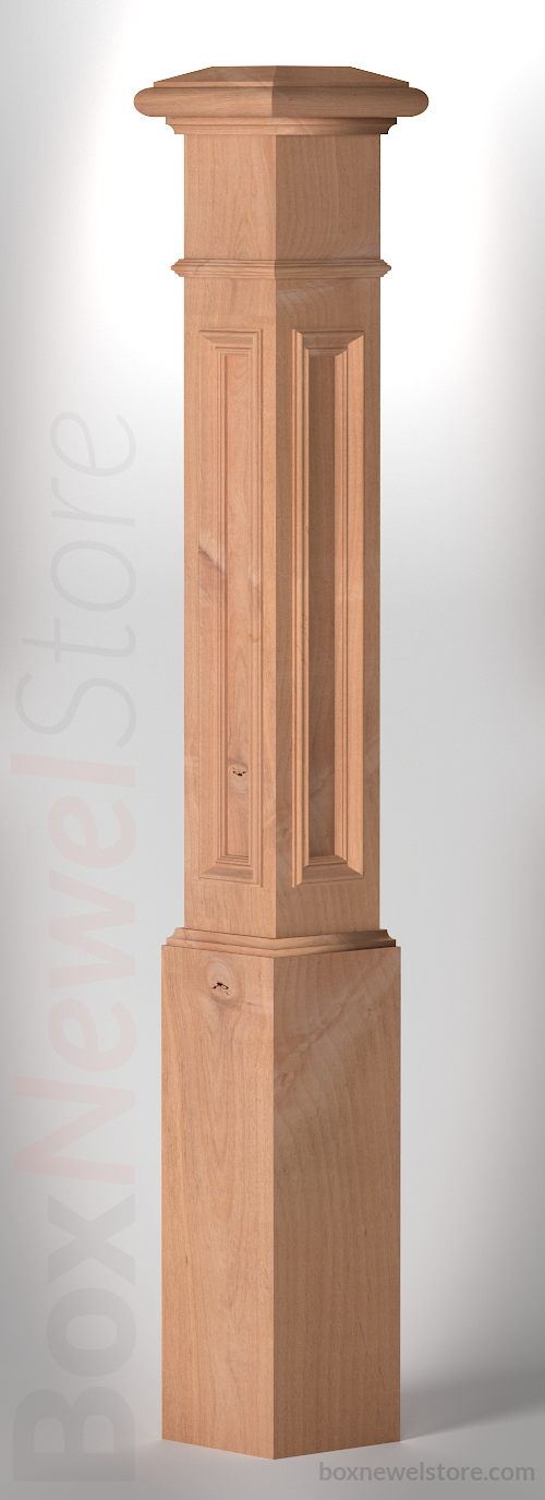 Box Newel Store Classic Knotty Alder Box Newel, SFI Classic Cap with Cove, Lower Recessed Panels with Panel Cap, Pencil Mold Trimband, Loose Basewrap with Cove