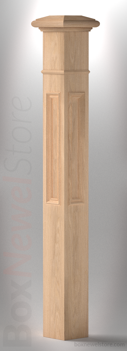 Box Newel Store Classic White Oak Box Newel, SFI Classic Cap with Cove, Lower Recessed Panels with Panel Cap, Pencil Mold Trimband