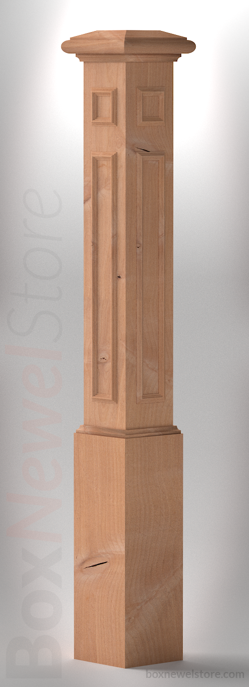 Box Newel Store Classic Knotty Alder Box Newel, SFI Classic Cap with Cove, Upper-Lower Planton Panels, Loose Basewrap with Cove