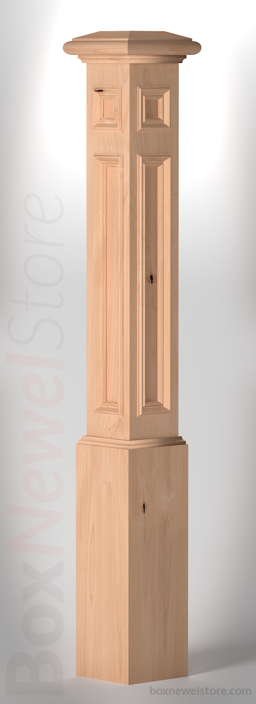 Box Newel Store Classic Clear Alder Box Newel, SFI Classic Cap with Cove, Upper-Lower Recessed Panels with Panel Cap, Loose Basewrap with Cove