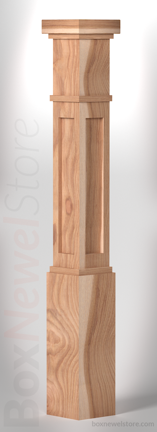 Box Newel Store Craftsman Hickory Box Newel, SFI Craftsman Cap with Square Trim, Craftsman Lower Recessed Panels, Craftsman Trimband, Loose Basewrap with Craftsman Trim